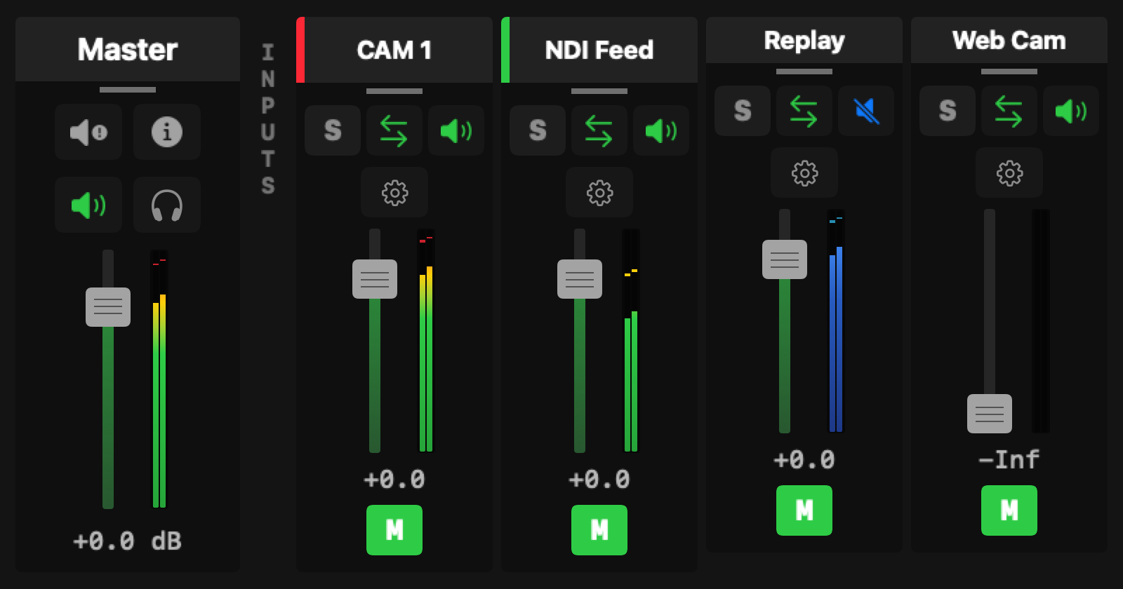 Mute — Silences the source on all buses. Muted sources still show meter activity.